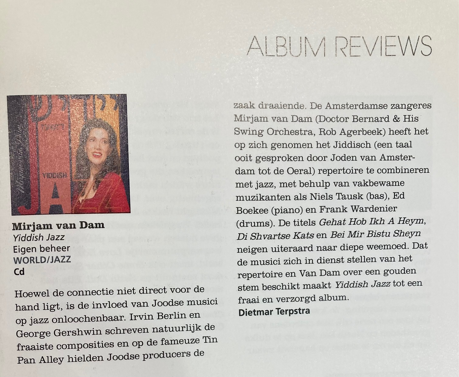 De treffende vertolkingen van de Yiddische en Amerikaanse songs laten horen dat Mirjam van Dam een vocaliste van grote klasse is. Lange jazzsolo’s zijn op deze plaat niet aan de orde; alles klinkt zo al overtuigend genoeg. Van Dam heeft met haar ensemble een fraai product afgeleverd.